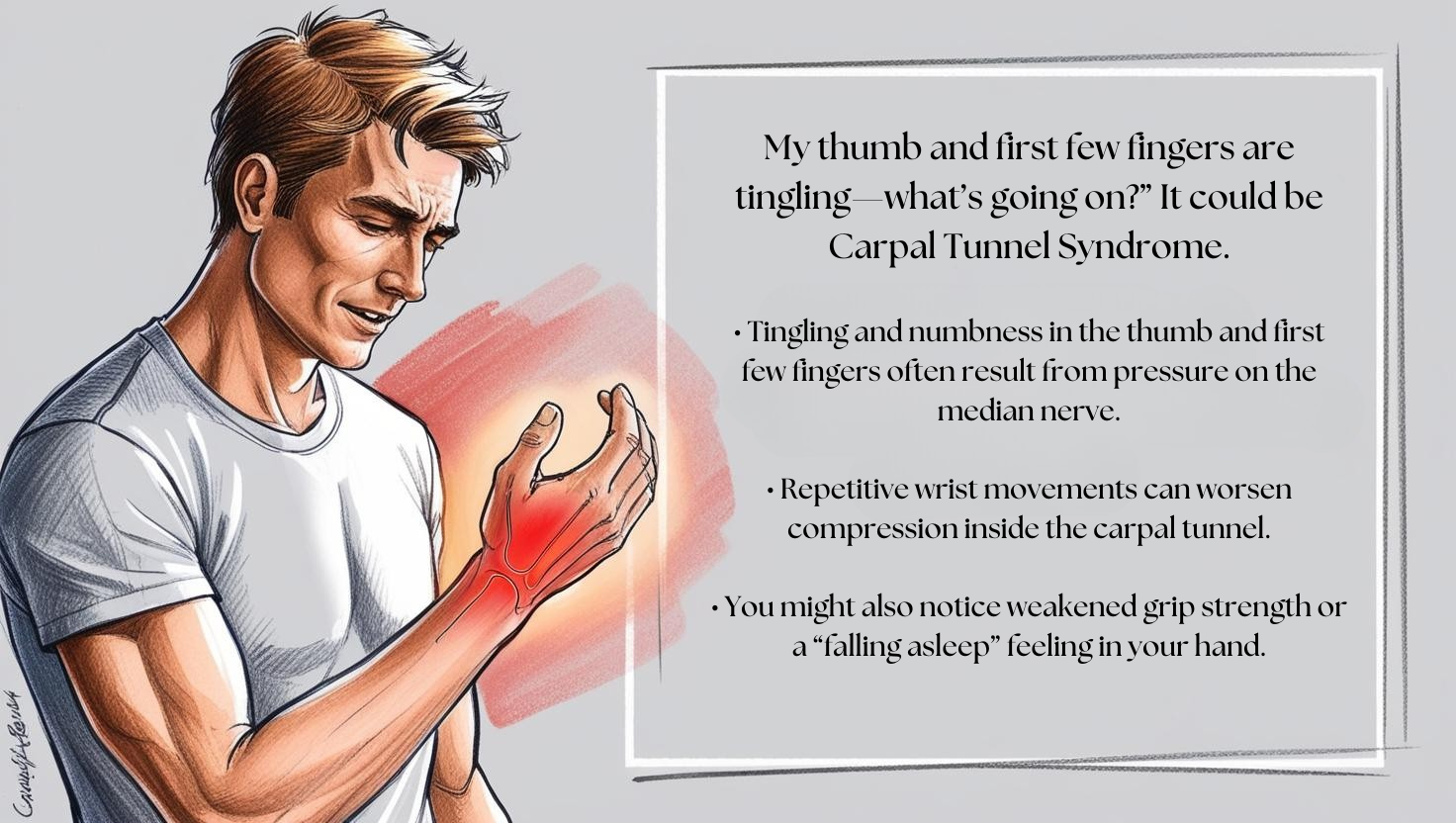 Carpal tunnel syndrome occurs when the median nerve, which runs through a narrow passage in your wrist (the carpal tunnel), becomes compressed or irritated. This often leads to tingling, numbness, or discomfort in the thumb, index, and middle fingers, alongside the base of the thumb. Sometimes, weakness in grip or a feeling that your hand “falls asleep” can also occur.