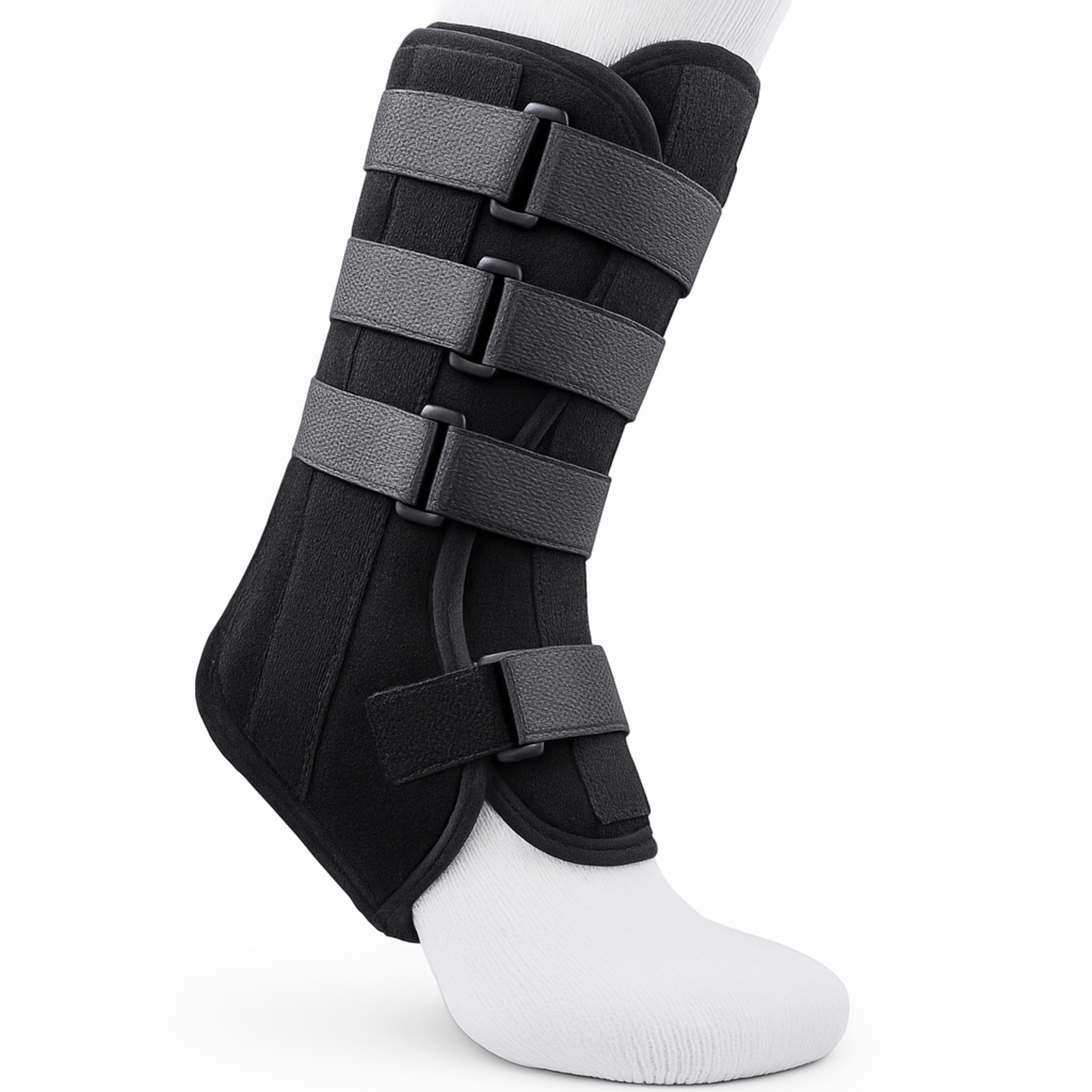 Inside the brace, padded neoprene‑based material sits next to the skin. Metal splints are built into the sides and along the back, and there is a flexible insert for the front. Four straps with buckles and hook‑and‑loop fastening secure the shell around the upper foot and the calf. All of these parts work together to cut down uncontrolled movement at the ankle, guide how weight passes through the joint, and give a steady feeling of support during daily activities.