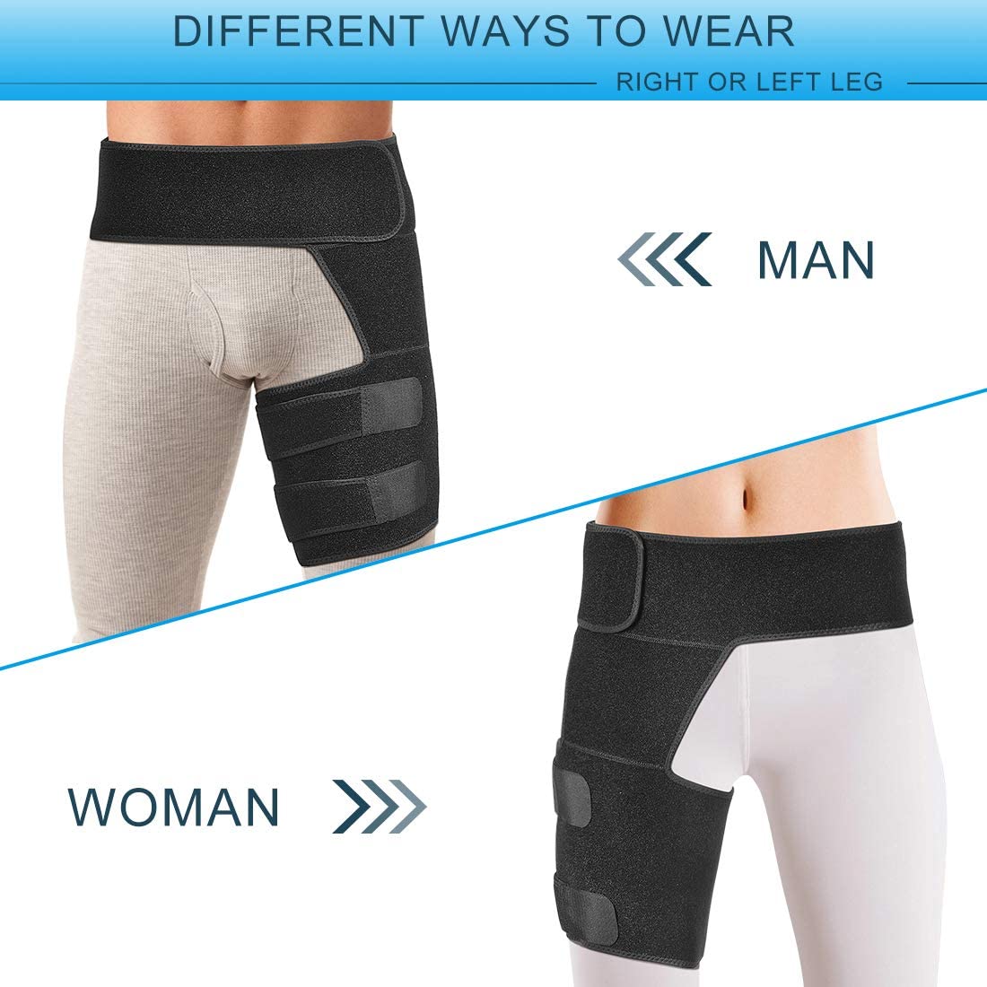 A good fit makes a big difference to both comfort and effect. The pelvic band should sit low around the pelvis, over the bony ridge at the top of the hips and across the sacrum, not high on the waist alone. The upper‑thigh cuff should sit around the top of the thigh on the side where your symptoms are most marked, and it should be clear of the groin crease.